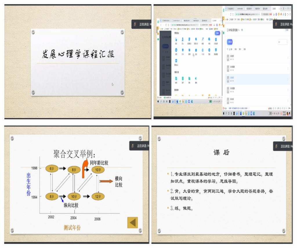 尹慧围绕考研等各类考试对《发展心理学》的课程建设经验做了分享交流。在课前进行学情和教学分析,分析过程中进行一系列的课堂教学准备,使学生提前了解学习任务,安排学生观看针对性视频并做相应的测试题计入平时成绩。课中的教学以讲授为主、提问、讨论、演示实验为辅的方式进行。使用题库进行随堂测试,参考考研真题,帮助学生巩固知识点。课后要求强调学生重视课本、制作思维导图、整理笔记和知识点;练题、做题的基础上还需要大量的背诵,学会答题思路。